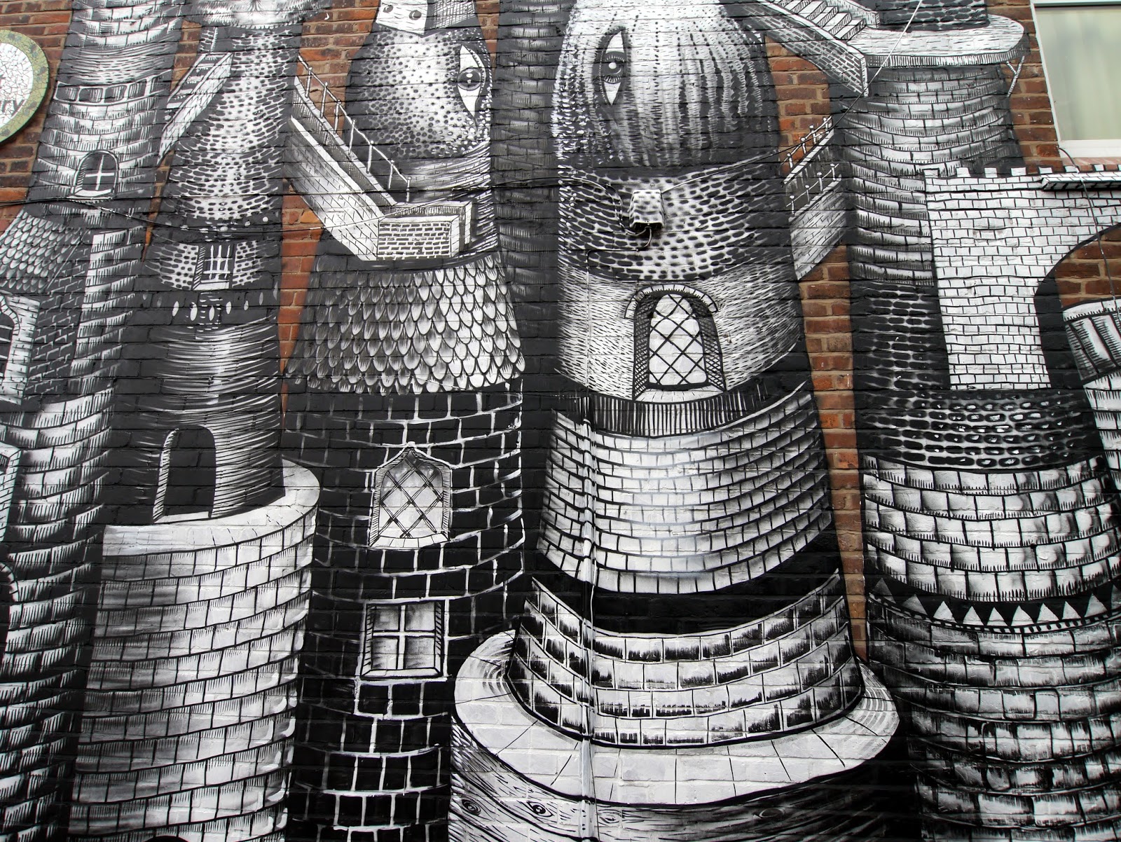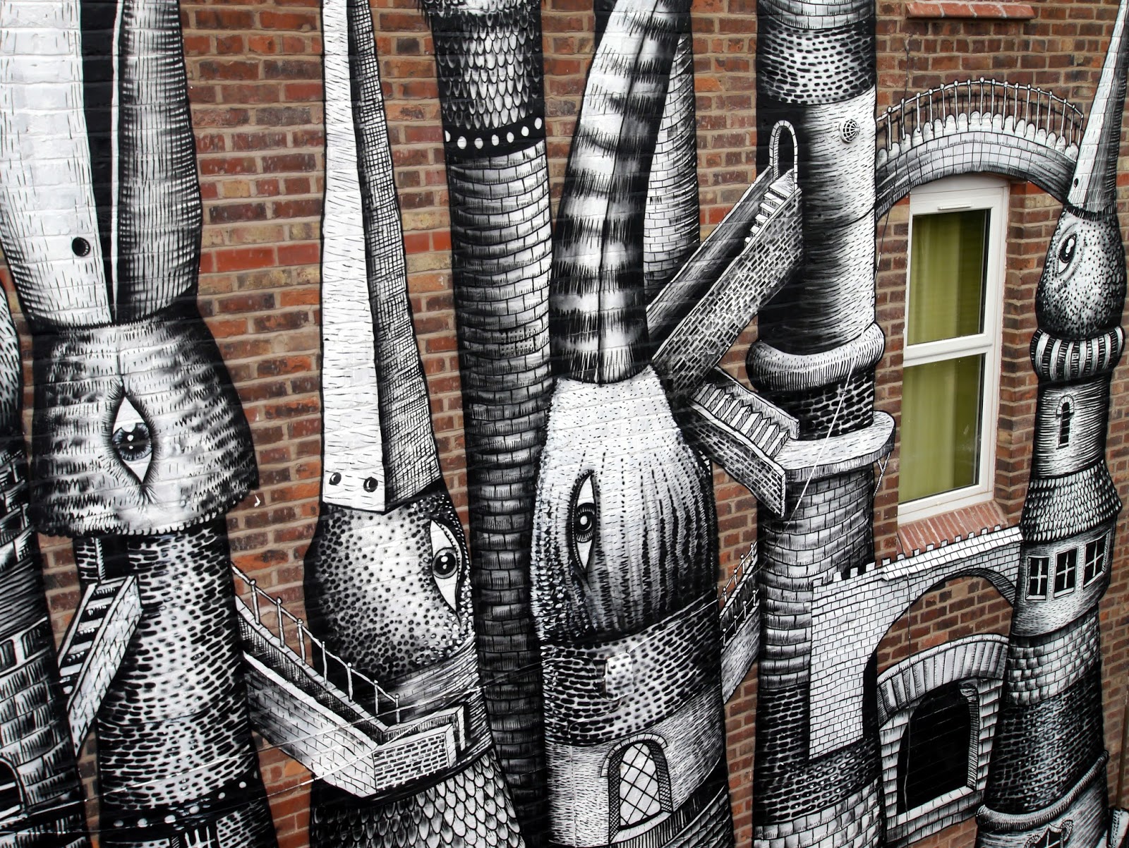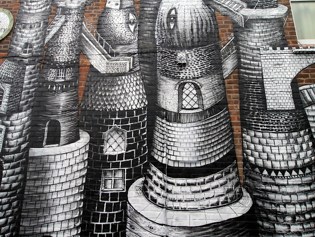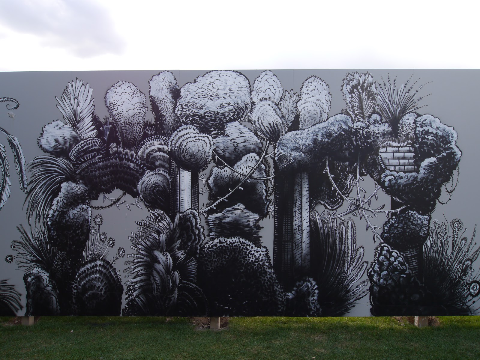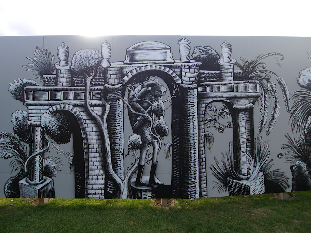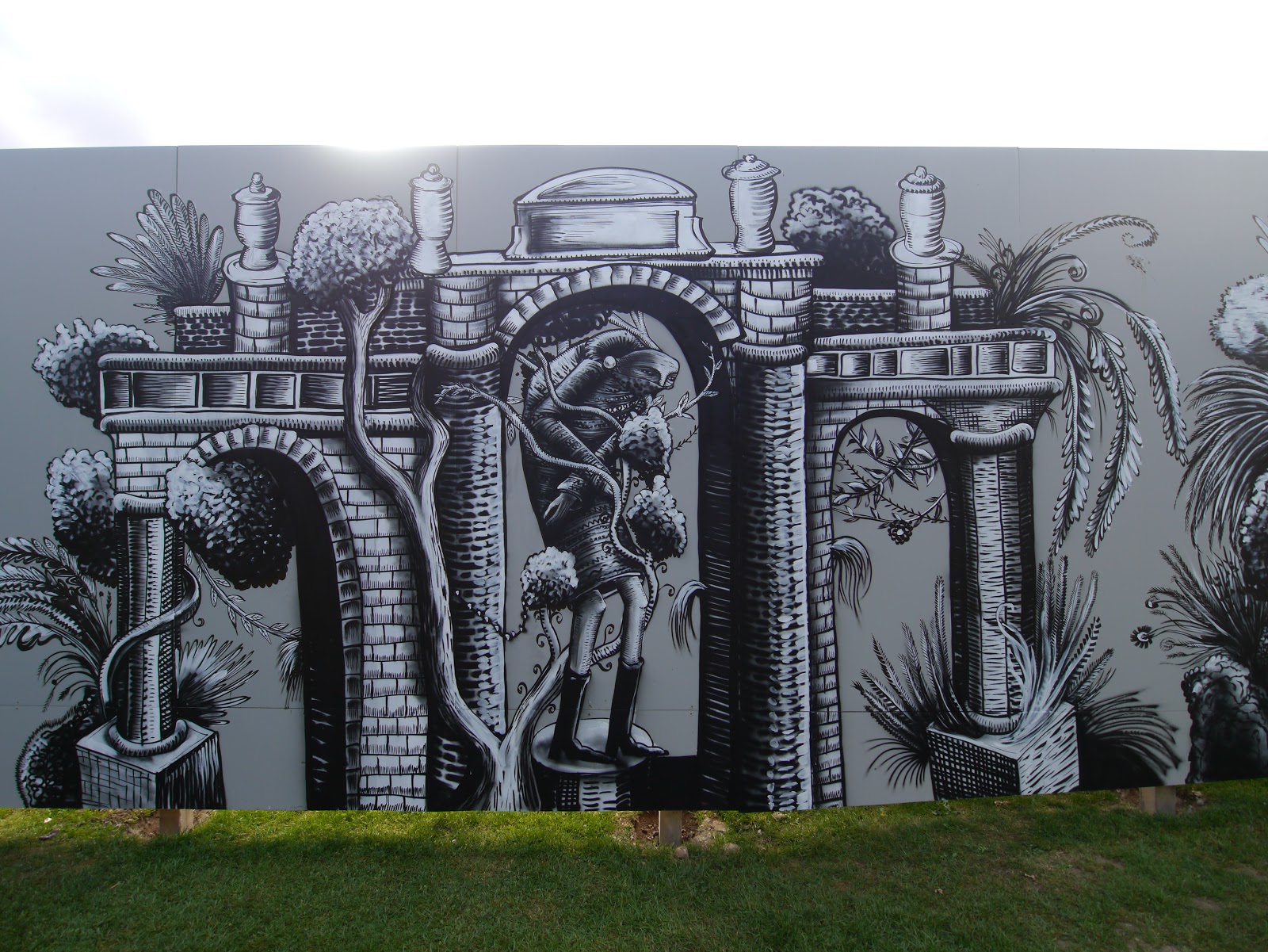 This spring I got invited by the Dulwich picture gallery to paint on some hoardings as they built their summer pavilion. I decided on something sequential showing architectural elements being overcome by nature and decay. Something i deal with a lot in my mural work and also something i find interesting in old paintings and etchings. I'm interested in cycles of decay with monuments and buildings. Nature can often envelop structures over and over again through time. Wars, gentrification, political changes and fashions can mean buildings can drift in and out of times of care and disrepair. I often like to think about my murals being a brief flourish in the life of a building. A moment of energy in an often dead space.