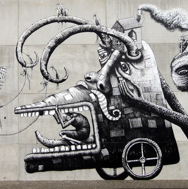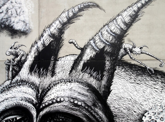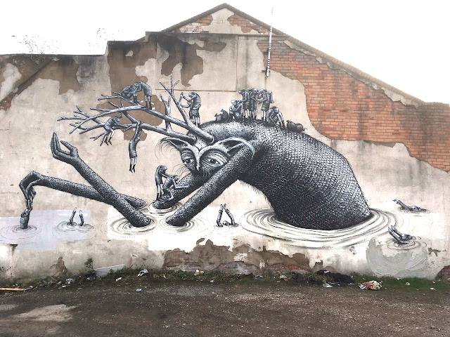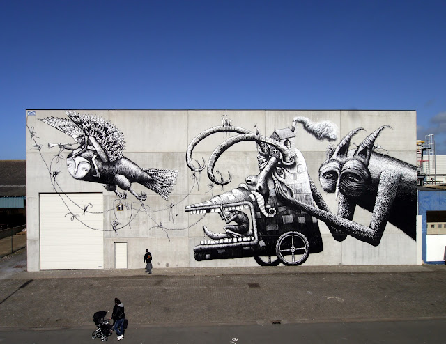 Out in Belgium again painting in the village of Werchter for north west walls. A huge beast thats slowly picking people off its back and devouring them without a fight. The people instead just fight each other. Take whatever meaning you like but for me at this particular time i felt like the beast was the main stream media. Great opportunity to paint these vast sculptural objects designed and curated by Arne Quinze
